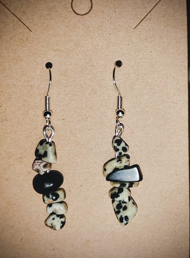 Leopardskin Jasper and Onyx gemstone chips, French hook wire with rubber backs to prevent slippage.